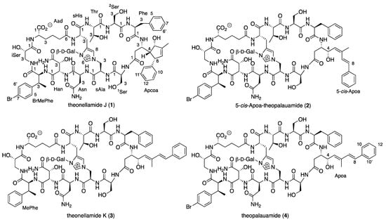 Large-scale 9:9:2 EtOAc/MeOH/H2O extract of the sponge T. swinhoei (order Tetractinellida, family Theonellidae), sampling #1156 which was collected in February 1982 by scuba diving at a depth of 20 m in the southern part of the Gulf of Aqaba (freeze-dried material that was stored in deep freezing since then), followed by several steps of purification afforded four pure compounds, three of which presented identical negative ESI MS ion and molecular formula: the known theopalauamide [] (4, m/z 1745.5978, [M − H]−, C76H9879BrN16O27, the major theonellamide), theonellamide J (1, m/z 1747.6157, [M + H]+, C76H10079BrN16O27), and 5-cis-Apoa-theopalauamide (2, m/z 1769.5944, [M + Na]+, C76H9979BrN16O27Na), and the fourth theonellamide K (3, m/z 1669.7034, [M + H]+, C76H101N16O27) (Figure 1).