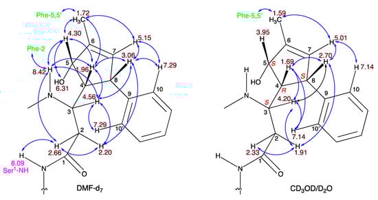Theonellamide J (1) presented an identical molecular formula of C76H9979BrN16O27 and thirty-five degrees of unsaturation, as 4. Its UV spectrum presented one significant absorption at 212 nm, in contrast to the other theonellamides that presented a significant UV absorption at ~288 nm [], suggesting the absence of the conjugated diene in 1. The structure of 1 was solved by analyses of its 1D and 2D NMR spectra in three solvent systems: 4:1 DMSO-d6:H2O at 50 °C (Figures S13–S21 and Table S3), 4:1 DMSO-d6:D2O at 50 °C (Figures S22–S29 and Table S4), and DMF-d7 (Figures S30–S37 and Table S5). The presence of a tri-substituted double-bond, in 1, instead of the conjugated system of the 3-amino-4-hydroxy-6-methyl-8-phenyl-5E,7E-octadienoic acid (Apoa) in the theonellamides including 2–4, was evident from the NMR data of 1–4 (4:1 DMSO-d6:H2O at 50 °C, Table 1 and Tables S3, S6, S7, S2). The structure elucidation of 1 was achieved by analyses of the 1H, 13C and 15N, 1D and 2D (COSY, TOCSY, ROESY, H-C and H-N HSQC, and H-C and H-N HMBC, Figures S13–S21) spectra of 1 in 4:1 DMSO-d6:H2O at 50 °C. Based on these analyses, the following amino acid and sugar derivatives were established and found identical with those of 4: 2-aminoadipic acid (Aad), asparagine (Asn), 3-methyl-p-bromophenylalanine (BrMePhe), histidinoalanyl (sHis-sAla), hydroxyasparagine (Han), iso-serine (iSer), phenylalanine (Phe), two serine (Ser) units, threonine (Thr), and galactose (Gal). The structure elucidation of the last amino acid derivative we named 3-amino-5-hydroxy-6-methyl-8-phenyl-4,8-cyclo-6-octenoic acid (Apcoa) was much more challenging and is described in detail below. COSY correlations (Table S3 and Figure S19) of 1 in 4:1 DMSO-d6:H2O at 50 °C afforded three continuous spin systems: (a) H-2a, H-2b, H-3 and 3-NH; (b) H-4, H-5, 6-Me, H-7 and H-8 that closes a ring due to correlation of H-8 with H-4; and (c) H-10,10’, H-11,11’, and H-12. TOCSY correlations in the same solvent system allowed the connection of H-3 with H-4. Correlations from COSY experiments of 1 in 4:1 DMSO-d6:D2O at 50 °C (Table S4 and Figure S27) and in DMF-d7 (Table S5 and Figure S34) confirmed the connectivity of H-2a and H-2b through H-8 and the closure of a five-membered ring through correlations between H-4 and H-8. Data from the HSQC spectra in the three solvent systems (listed above, Tables S3–S5) established the connectivity between adjacent proton and carbons. HMBC correlations (in 4:1 DMSO-d6:H2O at 50 °C, Table S3 and Figure S16) of H-2b (δH 1.93) with the carboxyamide carbon at δC 171.8 (C-1), of H-2a (δH 2.33) with the nitrogen-bearing carbon at δC 48.3 (C-3), of H-4 (δH 1.71) with the oxygen-bearing and quaternary sp2 carbons at δC 78.9 (C-5) and 145.6 (C-9), of H-5 (δH 3.98) with C-3 and the two sp2 carbons at δC 142.3 (C-6) and 129.1 (C-7), of the proton signal of 6-Me (δH 1.61) with C-5, C-6, and C-7, of the vinyl proton H-7 (δH 5.02) with C-4, C-6 and the methine carbon at δC 50.6 (C-8), of H-8 (δH 2.76) with the symmetric aromatic carbons at δC 128.3 (C-10,10’), of the symmetric aromatic protons H-10,10’ (δH 7.14) with C-8 and C-10’,10, of H-11,11’ (δH 7.20) with C-9, C-11’,11 and the aromatic carbon at δC 127.0 (C-12), established the structure of the later moiety as 3-amino-5-hydroxy-6-methyl-8-phenyl-4,8-cyclo-6-octenoyl (Apcoa). The latter assignment was supported by the HMBC correlations (in DMF-d7, Table S5) of H-2a and 2b (δH 2.66, 2.20, respectively) with the carboxyamide at δC 172.5 (C-1) and methine carbon at δC 48.8 (C-3), of H-4 (δH 1.96) with the carbons at δC 79.2, 50.9, and 146.0 (C-5, C-8, and C-9, respectively), of H-5 (δH 4.30) with the carbons at δC 152.8 and 128.8 (C-6 and C-7, respectively), of 6-Me (δH 1.72) with the carbons at δC 79.2, 142.8, and 128.8 (C-5, C-6, and C-7, respectively), of H-7 (δH 5.15) with the carbons at δC 62.4, 79.2, 142.8, 13.4, and 50.9 (C-4, C-5, C-6, 6-Me, and C-8, respectively), of H-8 (δH 3.06) with carbons at δC 62.4, 142.8, and 146.0 (C-4, C-6, and C-9, respectively), of H-10,10 (δH 7.21) with the carbons at δC 128.6 and 128.2 (C-10’,10 and C-11,11’, respectively) and of H-11,11’ (δH 7.29) with C-9, C-11’,11, and C-12 (δC 126.4). The relative configuration of the chiral centers of the cyclopentene ring were established based on the NOE correlations in DMF-d7 and in 4:1 DMSO-d6:D2O at 50 °C, between H-4 and H-5 and H-8, as 4R*,5S*,8S* (Tables S4 and S5 and Figure 2). In 4:1 DMSO-d6:D2O and 4:1 DMSO-d6:H2O at 50 °C, the signal of H-5 resonates close to the HDO and H2O signal and no NOE correlations with it were observed. Taking into consideration the biosynthetic route of Apoa (Figure 3) [], where the absolute configuration of C-3 in 1 is identical with C-3 of 4 and that the hydroxy group at C-5 of 1 is derived from the same epoxide which leads to the hydroxy group at C-4 of 4, we suggest that the absolute configuration of the chiral centers of the Apcoa subunit of is 3S,4R,5S,8S.