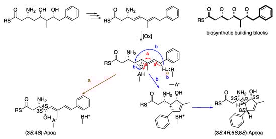 Suggested biosynthetic scheme of the (3S,4S)-Apoa and (3S,4R,5S,8S)-Apcoa units.