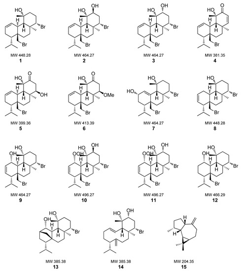 As far as diterpenes 1–14 are concerned, they share relatively similar oxygenated carbocycles decorated with at least one Br atom that is possibly important for the exhibition of activity on epibiotic organisms. Nonetheless, it is evident that the presence of the bromomethylene moiety enhances the compounds‘ activity, as evidenced by the significantly lower activity values exhibited by 13 and 14.