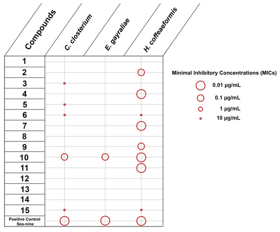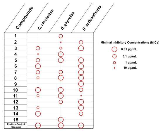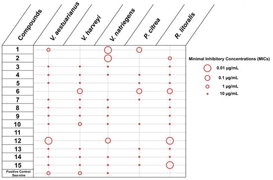 Concerning the evaluation of compounds 1–15 against marine bacteria, among the 15 tested compounds, only compound 11 did not show activity. All other compounds inhibited at least two marine bacteria, with one (2), three (1, 6, 12), five (3, 5, 8, 9, 13) and five (4, 7, 10, 14, 15) molecules inhibiting two, three, four and all five marine bacteria, respectively (Figure 2). Compounds 4, 7, 10, 14 and 15, which showed inhibition of adhesion against all five marine pathogens were active only at the highest concentration (10 µg/mL). In contrast, compounds 1, 6 and 12, which inhibited the adhesion of three biofoulers could be considered as the most effective since most of the MIC values observed were below 0.1 µg/mL. R. litoralis, which faced the least impact on its growth, appeared the most sensitive, with 13 molecules inhibiting its adhesion. It is interesting to note that SeaNine is less efficient towards adhesion inhibition than the most active compounds and was not active at all against P. citrea and R. littoralis.
