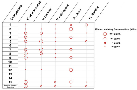 According to the results (Figure 4), compounds 6, 10, 11, 13 and 14 did not show any activity against the growth of any of the tested marine bacteria. However, compounds 1–3, 5, 7 and 15 showed activity against four out of the five marine bacteria tested, while compounds 4, 8, 9 and 12 inhibited three out of five marine bacteria. The most potent compounds with the lowest MIC values were compounds 5, 7 and 15. Among marine bacteria, R. litoralis was the most resistant, with its growth affected by compounds 3 and 15 at high concentrations (10 µg/mL) and compounds 1 and 5 at low concentrations (0.1 and 1 µg/mL, respectively). On the contrary, V. aestuarianus and V. natriegens were the most impacted, being susceptible to 10 and 9 compounds, respectively. Among them, V. aestuarianus appeared more sensitive than V. natriegens, since seven metabolites were active with MIC values ≤ 0.1 µg/mL. It is interesting to note that some compounds were more active than the positive control, which confirms the great potential of the algal metabolites for inhibition of bacterial growth.