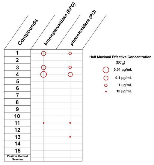 Among the 15 tested metabolites (1–15), compounds 3, 5 and 15 were active against a wide range of biofoulers. They showed at least one positive response towards the panel of organisms tested, whether on the biofoulers’ growth or adhesion or on enzymes; they displayed a broad-spectrum type of activity. More precisely, compounds 1–10, 12–15 were active against bacterial adhesion and compounds 1–5, 7–9, 12 and 15 against bacterial growth. Among them, compounds 1, 6 and 12 were the most active with activities at lower concentration against bacterial adhesion, as well as compounds 5, 7 and 15 against bacterial growth. Then, compounds 2–7, 9–11 and 15 were active against microalgal adhesion and all compounds against microalgal growth. Among them, compounds 10 was the most active against microalgal adhesion, and most of the compounds (except for compound 2, 4, 11) appeared active at concentration under 0.1 µg/mL against microalgal growth. Finally, compounds 1, 3, 4, 11 and 13 were active against BPO and/or PO. Among them, compound 4 appeared as the most potent with EC50 value < 0.1 µg/mL. Such metabolites have the potential to be used as booster compounds in antifouling formulations.