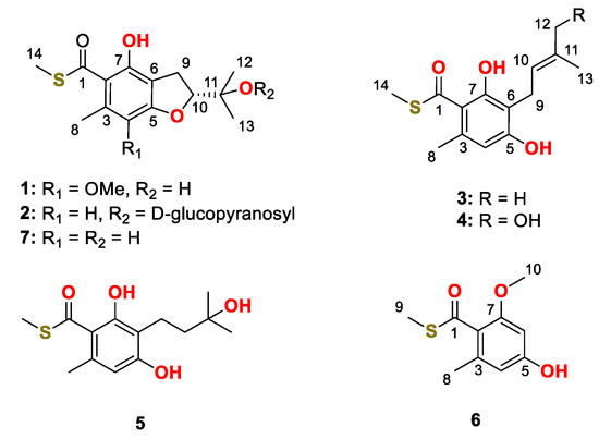 Deep-sea-derived fungi are a special group of microorganisms collected from sediment or water at a depth of over 1000 m. Due to their potential ability to produce novel and bioactive natural products promoted by the extreme environment, deep-sea-derived fungi have attracted considerable attention from both natural product and medicinal chemists [12]. In the course of searching for bioactive metabolites from deep-sea-derived fungi, Talaromyces indigoticus FS688—isolated from the South China Sea—was investigated and seven unusual thioester-containing benzoate derivatives were isolated (Figure 1). Herein, the details of the isolation, the structure identification and the biological evaluation of compounds 1–7 are discussed.