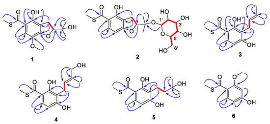 COSY (red bold lines) and key HMBC correlations (blue arrows) of compounds 1–6.