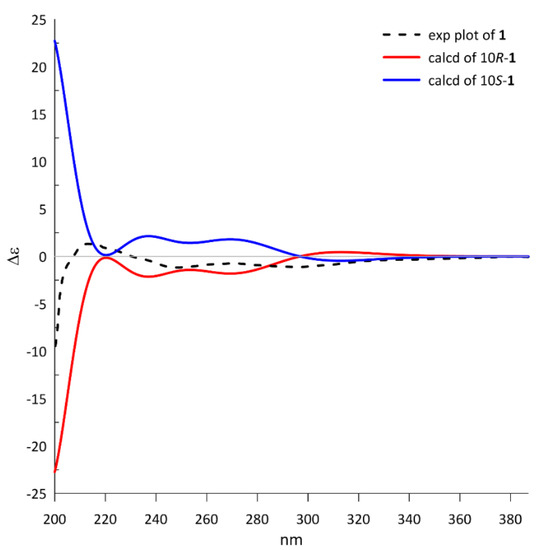 Because only one chiral center was detected in 1, the absolute configuration could be directly determined by comparing the theoretical ECD spectrum with the experimental plot. The calculated ECD spectrum of 10R-1 at the PBE1PBE/tzvp level exhibited an excellent fit to the experimental plot (Figure 3), assigning the 10R configuration.