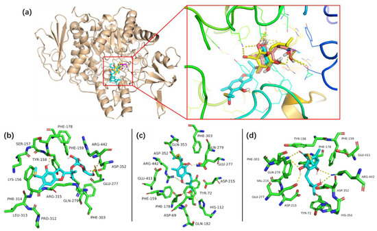 The complexes of compounds 1, 4 and 5 binding in the active site of α-glucosidase (a) and the details of the interaction between compounds 1 (b), 4 (c), 5 (d) and the amino acid residue.