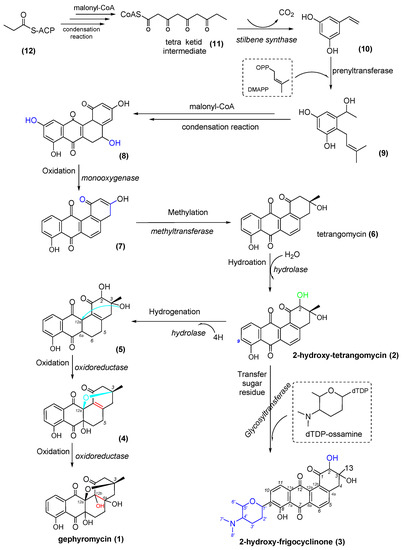 - Gerhard, B.; Gerhard, L.; Kadja, M.; Andreas, H.; Tobias, A.M.G.; Anke, D.; Alan, T.B.; James, E.M.S.; Niko, K.; Werner, E.G.M. Gephyromycin, the first bridged angucyclinone, from Streptomyces griseus strain NTK 14. Phytochemistry 2005, 66, 1366–1373. [Google Scholar]