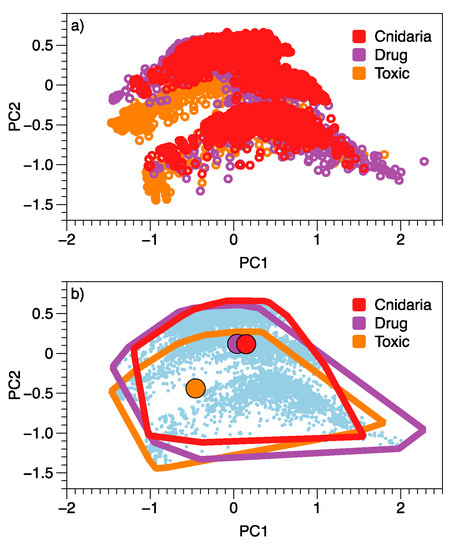 Relationships among approved drugs, Cnidaria NPs and toxic compounds based on a principal components analysis of 51 QikProp-generated variables for each molecule. Group membership for individual molecules is highlighted in (a), with centroids and outliers of each group emphasised in (b).