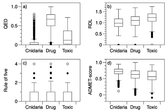 The application of different methods generally addresses different facets of the potential value of NPs. Contrasts between methods can therefore be more informative than the application of a single approach. The concept of ‘value’ is, of course, multifaceted and depends on the application. We are interested in the general characterisation of a large taxonomically-defined group of marine NPs. In this study, we apply examples of drug-likeness (QED, RDL, and rule-of-five), ligand likeness, molecular docking, and toxicity QSAR (ADMET-score) to define NP potential and provide a synthesis for metabolites from Cnidaria. Cnidaria NPs were compared to both drug and toxin reference sets using 51 properties, including absorption, distribution, metabolism, and excretion (ADME) variables derived using the Schrödinger QikProp software.