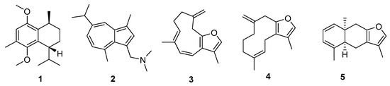 Cnidaria NPs with relatively high QED (>0.55) and summed drug index values (>2.42). Unique identifiers in MarinLit and names (where a name was used in the original description) are as follows: (1) L22017, (2) L1211 N,N-dimethylamino-3-guaiazulenylmethane, (3) L1854 furanotriene, (4) L339, (5) L2401 tubipofuran. Three of the metabolites had at least one Glide score more negative than −7.