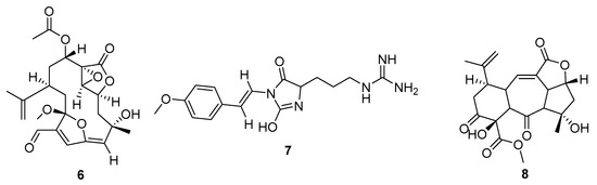 Metabolites from Cnidaria with poor QED scores (=0), but favourable summed drug similarity indices (>2.06). MarinLit codes and names are: (6) L12916 3-methoxy-8-hydroxylophotoxin, (7) L27157 parazoanthine F, (8) L24340 sinumaximol I.