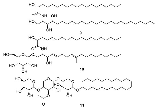 The Cnidaria NPs ranked as least druglike by summed index and QED were relatively large metabolites: glycosphingolipids, ceramides, sarcoehrenosides, glycosides, and sphingolipids (Figure 5). This group was not without activity in the original descriptions of the molecules. Metabolite 9 (L24815) was shown to have some activity against H5N1 avian influenza [15]. None of this group had activity in the virtual docking screening with Glide.