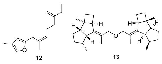A small group of molecules had QED scores above 0.5 but relatively low summed index values (Figure 6). The majority of the metabolites were furanosesquiterpenes (e.g., 12), with one dikelsoenyl ether (13). The good QED scores presumably reflect good solubility and hydrogen donor/acceptor properties. No activities were reported in the original articles describing these metabolites. There were also no affinities identified in the virtual docking carried out using Glide.