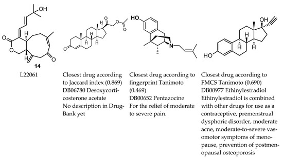 Closest drugs to 14 (L22061, asterolaurin H), a xenicane diterpenoid (Lin et al., 2011 [29]). This metabolite had relatively high Jaccard and Tanimoto values with respect to approved drugs, but average QED, RDL, and Admet scores. Lin et al., 2011 [29] reported cytotoxic activity against Hep-2 (human laryngeal carcinoma), Daoy (human medulloblastoma), MCF-7 (human breast adenocarcinoma), and WiDr (human colon adenocarcinoma) tumour cells.