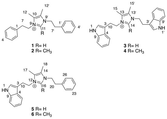 Structures of bacillimidazoles A–F (1–6) with central imidazolium numberings indicated for each subgroup.
