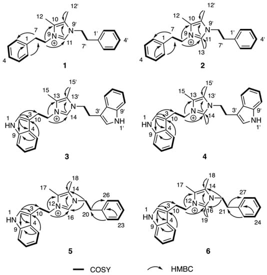 Approaches employed to solve the structures of 1–4 also were applied to determine the structures of 5 and 6 in Table 2. Analysis of HRMS data for bacillimidazole E (5) and bacillimidazole F (6) made clear their molecular formulae as C23H26N3+ (m/z = 344.2134, M+, calcd 344.2121) and C24H28N3+ (m/z = 358.2283, M+, calcd 358.2278), respectively. In addition, review of their 13C NMR data suggested asymmetrical structures for both 5 and 6 since 23 13C NMR signals were observed in 5 (24 signals for 6). Additionally, comparisons of NMR data for 5 to those of 1 and 3 suggested the presence of an imidazolium ring, a phenyl ring, and a 3-indole ring in 5. Furthermore, H-2 (δH 7.03), assigned to the indole ring, showed an HMBC correlation to C-10 (δH 26.5); and H-22 (δH 7.04), assigned to the phenyl ring, showed an HMBC correlation to C-20 (δC 36.7) (Figure 3). COSY correlations were observed between H2-10 (δH 3.23) and H2-11 (δH 4.36), H2-19 (δH 4.18) and H2-20 (δH 2.84). H2-11 and H2-19 both showed HMBC correlations to C-16 (δC 135.4), which was assigned to the imidazolium ring (Figure 3). Therefore, 5 was believed to contain an indole ring, an imidazolium ring, and a phenyl moiety (Figure 2). In addition, two –CH2CH2– groups were found to intervene the three different cyclic structural motifs. In applying the established correlation data, we thus elucidated structure 5 as shown in Figure 2. The structure of 6 was determined in a fashion similar to that employed for 5, and was ultimately identified as an analog of 5 bearing a methyl group on the central imidazolium ring.