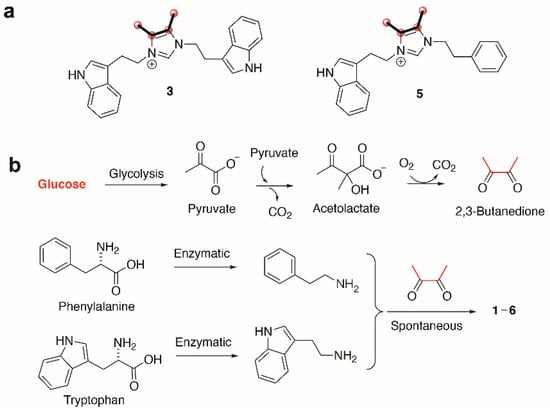 Biosynthesis of bacillimidazoles. (a) Isotopic labeling of bacillimidazoles C (3) and E (5). Carbons highlighted with bold bonds and red spheres showed high levels of 13C incorporation. (b) Proposed biosynthetic pathway to compounds 1–6 calls for enzymatic production of tryptamine, phenethylamine and 2,3-butanedione (from glucose); all subsequent steps may proceed spontaneously.