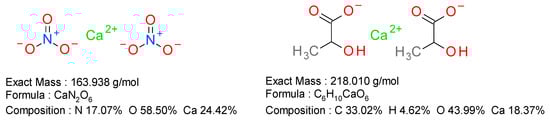 Based on the carbon content of the sample of 30.69 ± 0.4% and reported to the expected theoretical content of 33.02%, the content of calcium lactate in the sample was calculated as 92.94 ± 1.21%. The presence of nitrogen in the sample indicates the possibility of the existence of another calcium salt, most probably of calcium nitrate. Figure 2 represents the elemental composition of the two compounds: calcium lactate and calcium nitrate.