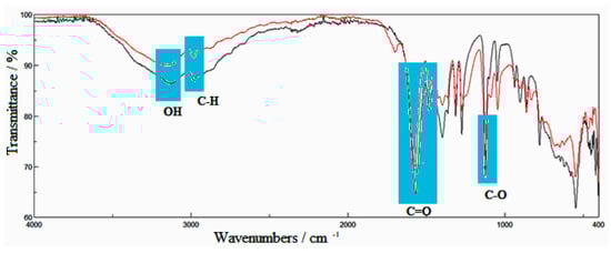 FTIR spectra of synthesized calcium lactate (red line) and standard calcium lactate (black line).
