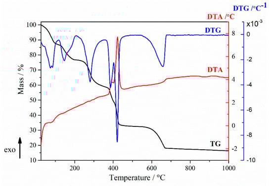 Thermal measurements were performed on a Mettler Toledo TGA/SDTA 851e thermal analyzer apparatus, in an airflow atmosphere with a flow rate of 80 mL min−1 and at a heating rate of 10 K min−1. The TG curves were recorded from room temperature to 1000 °C. The samples were held in alumina crucibles.