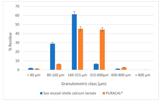 From Figure 6 it can be noticed that most of the particles belonging to calcium lactate from sea mussels have a particle size between 80 and 315 μm, meantime in the DC calcium lactate a considerable part of the particles have larger dimensions between 160–600 μm. These results well explain the flowability obtained values, as the smaller particles are flowing slowly, and the bigger ones present an excellent flow. Concerning the compressibility, it can be observed exactly the opposite, the particle diameters are justified by the significant difference in the powder’s density, but the preferable compressibility was exhibited by the lower sizes particles.