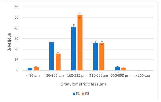 Figure 7 represented the histogram of particle size distribution on granulometric classes for both formulations.
