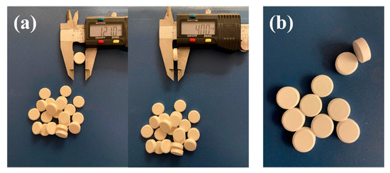 After manufacturing, the obtained tablets were tested to determine the quality characteristics of the final products, according to compendial specifications and in force regulations [58,59].