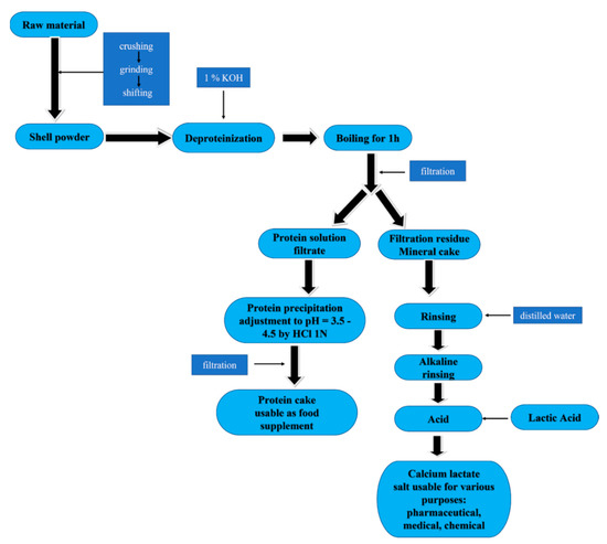 Flowchart for Calcium lactate technological synthesis from mussel shells.