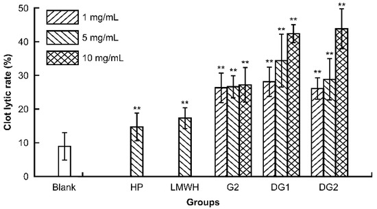 A clot lytic rate assay was employed to evaluate the thrombolytic activity in vitro of G2, DG1, and DG2. HP and LMWH were used as references. The clot lytic rate is defined as the ratio of mass of dissolved clot to original weight of clot after thermoregulation of sample solution. As presented in Figure 1, G2, DG1, DG2, HP, and LMWH at the experimental dose significantly enhanced the lytic clot rate in a dose- and molecular-dependent manner. The lytic clot rates of G2, DG1, and DG2 over the experimental dose were markedly more potent than those of HP and LMWH at 5 mg/mL. In addition, the results indicated that G2, DG1, and DG2 had high thrombolytic properties in vitro, which positively correlated with molecular weight.