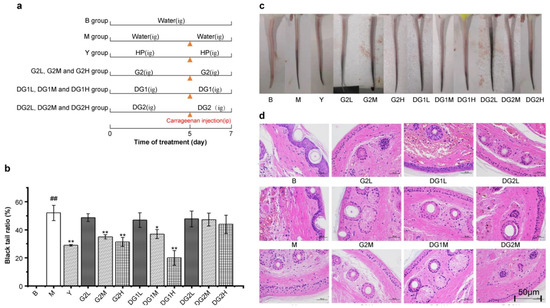 Figure 2. Schematic diagram of the experimental process (a); blacktail ratio diagram of the mice in each group (b); blacktail images of the mice (c); and HE staining section diagram of tail tissue (d). B group: the blank control group gavaged with water; M group: the model group gavaged with water and treated with carrageenan; and Y group: the positive control group gavaged with sodium heparin and treated with carrageenan. The suffixes L, M, and H in the group names represent the doses of 10 mg/kg, 20 mg/kg, and 40 mg/kg of gavage samples, respectively. “ig” mean intragastric gavage; “ip” mean intraperitoneal injections. Statistical significance: * p < 0.05, ** p < 0.01, as compared with model (M) group. # p < 0.05, ## p < 0.01, as compared with blank (B) group.