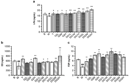 Figure 3. Fibrinolytic indexes in mice of different treatment groups for (a) tissue plasminogen activator (t-PA), (b) D-dimer (DD) mass concentration, and (c) fibrinogen degradation product (FDP). B group: the blank control group gavaged with water; M group: the model group gavaged with water and treated with carrageenan; and Y group: the positive control group gavaged with sodium heparin and treated with carrageenan. The suffixes L, M, and H in the group names represent the doses of 10 mg/kg, 20 mg/kg, and 40 mg/kg of gavage samples, respectively. All experimental groups except the blank control group were injected intraperitoneally with carrageenan. Statistical significance: * p < 0.05, ** p < 0.01, as compared with model (M) group. # p < 0.05, ## p < 0.01, as compared with blank control (B) group.