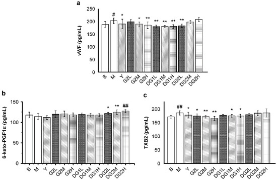 In summary, our results indicate that G2 and DG1, which had antithrombotic effects, mainly exerted antiplatelet aggregation activity by decreasing the vWF and TXB2 plasma levels. DG2 not only increased the level of 6-keto-PGF1α but also increased the TXB2 level.
