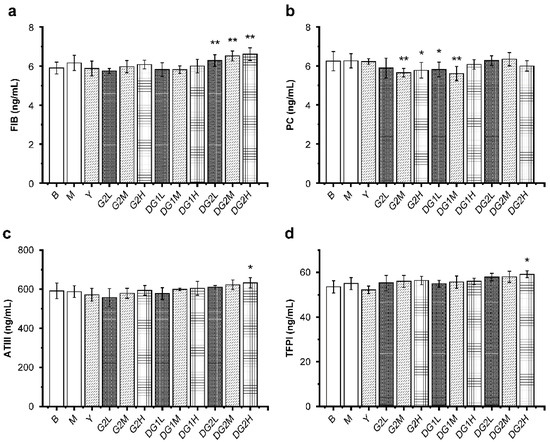 Figure 5. Mass concentrations of the anticoagulation indexes fibrinogen (FIB) (a); protein C (PC) (b); antithrombin III (ATIII) (c); and tissue factor pathway inhibitor (TFPI) (d) in mice of different treatment groups. B group: the blank control group gavaged with water; M group: the model group gavaged with water and treated with carrageenan; and Y group: the positive control group gavaged with sodium heparin and treated with carrageenan. The suffixes L, M, and H in the group names represent the doses of 10 mg/kg, 20 mg/kg, and 40 mg/kg of gavage samples, respectively. All experimental groups except the blank control group were injected intraperitoneally with carrageenan. Statistical significance: * p < 0.05, ** p < 0.01, as compared with model (M) group.