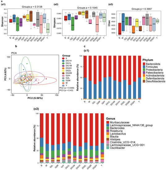 Figure 6. Effects of 7 days of clam heparinoid gavage on the intestinal flora. (a) Alpha diversity analysis of the Shannon index diagram (a1); Simpson index (a2); and ace index diagram (a3). (b) Beta diversity analysis of the principal component analysis (PCA). (c) The intestinal floral composition analysis at the phylum (c1) and genus (c2) levels. B group: the blank control group gavaged with water; M group: the model group gavaged with water and treated with carrageenan; and Y group: the positive control group gavaged with sodium heparin and treated with carrageenan. The suffixes L, M, and H in the group names represent the doses of 10 mg/kg, 20 mg/kg, and 40 mg/kg of gavage samples, respectively. All experimental groups except the blank control group were injected intraperitoneally with carrageenan.