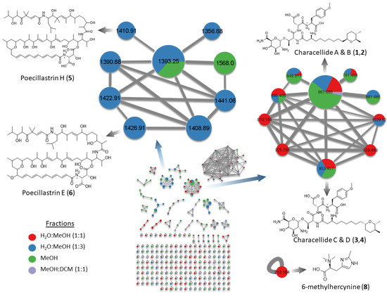 A second cluster of the molecular network only detected in CLMN contained analogues of chondropsin macrolide lactams such as poecillastrin H (5) that was recently isolated from a deep-sea sponge, Characella sp. [20]. From this annotated node, we also identified the presence of poecillastrin E (6), which has been isolated from a deep-sea tetractinellid sponge [13]. The presence of poecillastrin H was confirmed by characteristic 1H-NMR signals at δH 7.23 and doublet at δH 6.94 matching those found in the literature. Additional characteristic UV absorption at 370 nm was observed. Chondropsins are known to have potent cytotoxicity caused by selective inhibition of V-ATPases [21]. The presence of unidentified nodes, with a high ratio of edges per node, within this cluster suggested the presence of undiscovered analogs. Retrieving the nodes’ retention times and molecular weights from the molecular networking allowed us to carry out a targeted purification of these macrolides. Due to their extreme photosensitivity, the chemical structure of theses analogs could not be determined. These compounds may be only stable in the absence of light as in their natural environment.