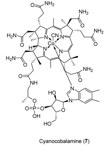 Cyanocobalamin (7): Pink amorphous solid; UV (DAD) λmax 360 nm and 270 nm; HRESIMS (+) m/z 1355.5719 [M + H]+ (calcd. For C63H89CoN14O14P, 1355.5752, Δ −2.1 ppm).