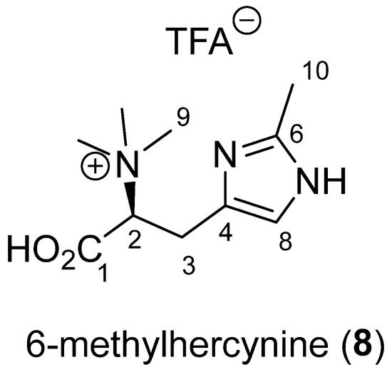 Compound 8 was isolated as a white amorphous powder. Its molecular formula was determined by HRESIMS to be C10H17N3O2 with m/z 212.1394 for [M + H]+ (Figure 3). 1H-NMR data revealed the presence of four methyl singlets at δH 3.30 (s, 9H, H-9), 2.71 (s, 3H, H-10), one aromatic methine at δH 7.27 (s, 1H, H-8), and an ABX system at δH 3.97 (dd, 1H, J = 12.0, 3.5 Hz, H-2), 3.44 (dd, 1H, J = 14.0, 3.5 Hz, H-3a) and 3.37 (dd, 1H, J = 14.0, 12.0 Hz, H-3b) (Table 1). HSQC and HMBC spectra of 8 indicated resonances associated with three non-protonated carbons: a carboxylic acid at δC 170.2 (C-1) and two aromatic carbons at δC 144.6 (C-6) and 128.3 (C-4). The only spin coupled system (SCS) was assigned through H-2/H-3a and H-3b COSY correlations. The H-3/C-1 and H-9/C-2 HMBC correlations established the presence of an N-trimethylated amino acid derivative. The connection between the aromatic ring and the SCS was evidenced by key H-3a and 3b/C-4 and C-8 HMBC correlations. The chemical shifts of the aromatic signals at C-4, C-6 and C-8 suggested the presence of an imidazole ring but one aromatic proton was missing in the 1H NMR spectrum. The fourth methyl at C-10 was located on the aromatic ring at C-6 due to a H-10/C-6 HMBC correlation. H-10 had only one correlation in HMBC confirming the presence of a substituted imidazole ring.
