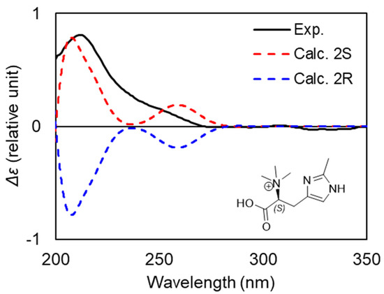 The absolute configuration at C-2 was determined by comparison between experimental and calculated electronic circular dichroism (ECD) spectra (Figure 4). After a conformational analysis and geometry optimization, the ECD spectra of the two possible enantiomers of 8 were calculated using time-dependent density functional theory (TDDFT). The electronic transition and rotational strength calculations were conducted at the B3LYP/6-11G(d,p) level with 50 transition states. The charge state of the molecule was predicted to be +1 due to the use of acidic conditions during RP-HPLC purification. However, the neutral zwitterion and doubly charged ion were also calculated for comparison with experimental data. Spectra were Boltzmann weighted based on a free-energy distribution and corrected with the UV data. In the calculated spectra of the (2S) enantiomer for all charged states, a positive Cotton effect at 215 nm that matches the experimental spectra of 8 was observed, allowing the assignment of (S)-6-methylhercynine. Moreover, the experimental spectra closely match previously published experimental spectra of L-histidine and S-hercynine, further supporting our TDDFT assignment [24,25].