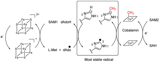 - Zhou, S.; Alkhalaf, L.M.; de los Santos, E.L.C.; Challis, G.L. Mechanistic insights into class B radical-S-adenosylmethionine methylases: Ubiquitous tailoring enzymes in natural product biosynthesis. Curr. Opin. Chem. Biol. 2016, 35, 73–79. [Google Scholar] [CrossRef] [PubMed]