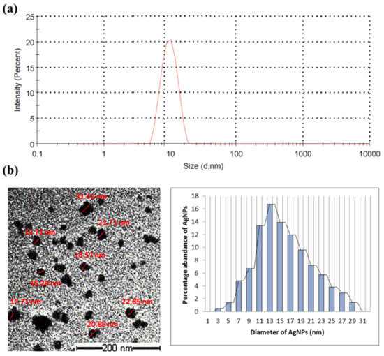 The particle size of the biosynthesized AgNPs was characterized by dynamic light scattering techniques using Zetasizer Nano ZS (Malvern Panalytical, Spectris plc, Egham, Surrey, UK). Transmission electron microscopy (TEM, a JEOL JEM-1230 JEOL, Tokyo, Japan) was utilized to obtain high-resolution, two-dimensional images of the biosynthesized AgNPs. The AgNPs morphology was visualized via TEM operated at an accelerating voltage of 200 kV. Samples were prepared by adding a drop of AgNPs suspension onto a carbon-coated copper grid and permitted to dry under an infrared lamp preceding the analysis. Nanoparticle size distribution was performed using the digitized TEM images. Thirty haphazardly selected TEM fields were treated with Image Pro-Plus software and the data obtained were reported in a histogram (Figure 1).