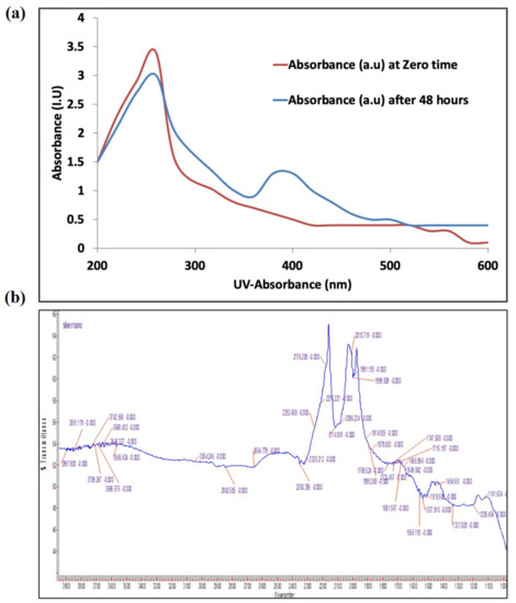 Characterization of biogenic AgNPs synthesized by Synechocystis sp. (a) UV–Vis light spectroscopy at 0 and 48 h of addition of AgNO3 to the cyanobacterial culture; (b) FTIR spectrum of cyanobacterial extract after 48 h of AgNO3 addition.