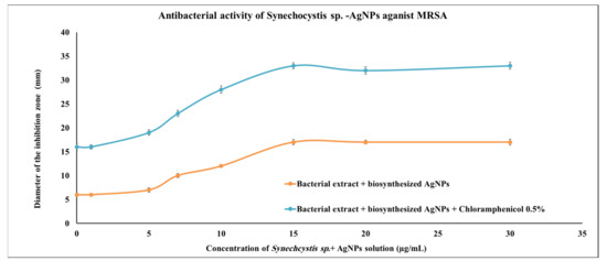 AgNPs produced by Synechocystis sp. were assessed for their anti-MRSA activity using the disc-diffusion method. Several concentrations of the cyanobacterial-AgNP extracts were investigated, and the lowest concentration with significant action was 10 μg/mL; however, the optimum concentration was 15 μg/mL, which was able to produce nearly the same activity as the positive control (0.5% chloramphenicol). When the same concentration (15 μg/mL) of Synechocystis sp.-AgNPs extract was combined with 0.5% chloramphenicol, the antibacterial activity increased nearly to 100% more than the 0.5% chloramphenicol alone (Figure 3).