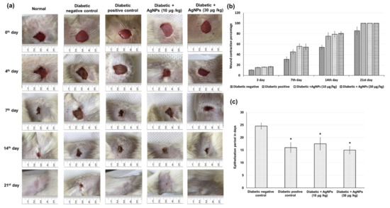 Effect of treatment with AgNPs green-synthesized by Synechocystis sp. on wound healing parameters including (a) photographic illustration of wound healing progression (b) wound contraction percentage in excision wound model obtained from different experimental groups at 0, 3, 7, 14, and 21 days of post wounding (c) epithelialization period. All values were expressed as mean ± SD (n = 6). * indicates statistically significant from diabetic negative control group (p < 0.05) using one-way ANOVA followed by Tukey’s test as a post hoc analysis.