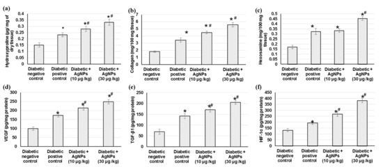 Effect of treatment with AgNPs green synthesized by Synechocystis sp. on (a) hydroxyproline content, (b) collagen, (c) hexosamine, (d) VEGF, (e) TGF-β1, and (f) HIF-1α in excision wound model. All values are expressed as mean ± SD (n = 6). * indicates statistically significant from diabetic negative control group, # indicates statistically significant from diabetic positive control group (p < 0.05) using one-way ANOVA followed by Tukey’s test as a post hoc analysis.