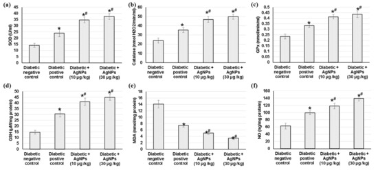 Effect of treatment with AgNPs green-synthesized by Synechocystis sp. on (a) SOD; (b) catalase; (c) GPx; (d) GSH; (e) MDA and (f) NO in excision wound model. All values were expressed as mean ± SD (n = 6). * indicates statistically significant from diabetic negative control group, # indicates statistically significant from diabetic positive control group (p < 0.05) using one-way ANOVA followed by Tukey’s test as a post hoc analysis.