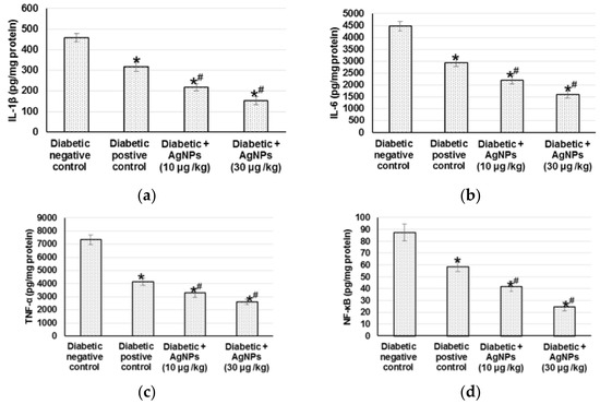 Effect of treatment with AgNPs green synthesized by Synechocystis sp. on (a) IL-1β; (b) IL-6; (c) TNF- and (d) NF-κB in excision wound model. All values were expressed as mean ± SD (n = 6). * indicates statistically significant from diabetic negative control group, # indicates statistically significant from diabetic positive control group (p < 0.05) using one-way ANOVA followed by Tukey’s test as a post hoc analysis.