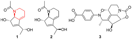 Compared to piperidines, indolizidine alkaloids have been isolated more frequently from marine Actinobacteria in recent years. Interestingly, indolizinium alkaloids, which are indolizidines with a positive charge on the heterocyclic nitrogen, were well-represented, despite being rare actinomycete secondary metabolites first discovered in 2016 [21].