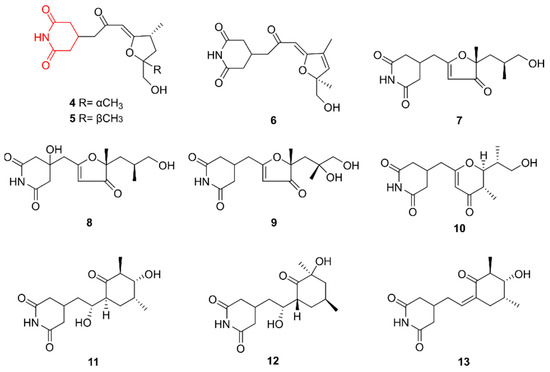 The glutarimide alkaloids streptoglutarimides A–J (4–13). The structural alkaloid group is represented in red.