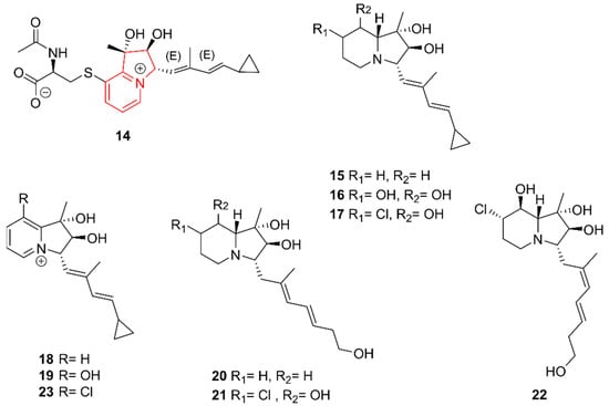 The indolizidine alkaloids streptopertusacin A (14) and cyclizidines B–J (15–23). The structural alkaloid group is represented in red.